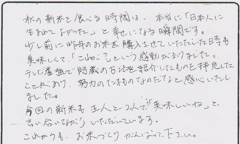 いつも、安心して食べられるおいしいお米をありがとうございます。
